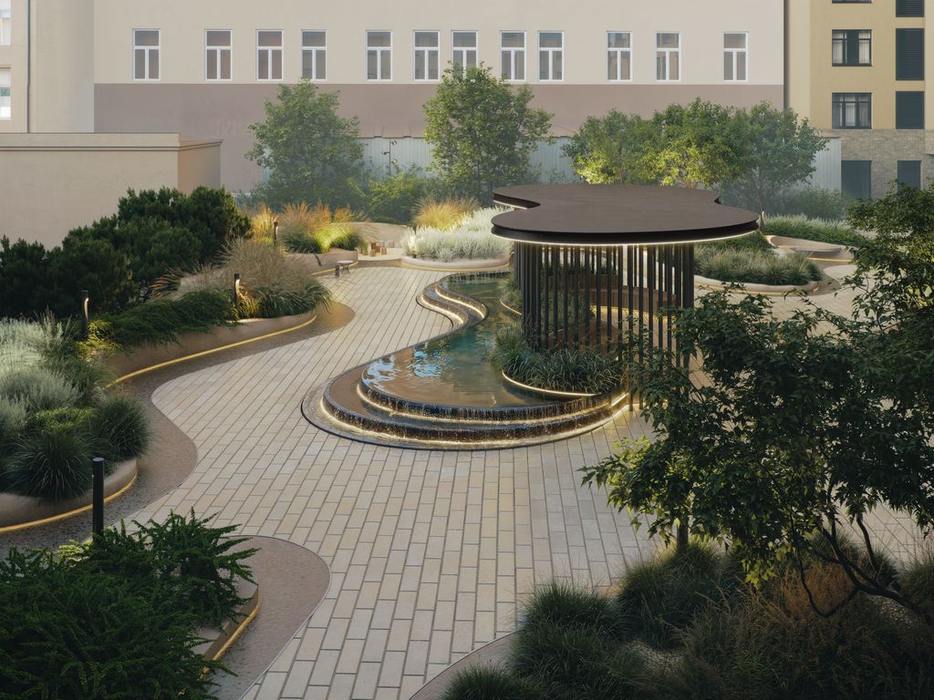 Центральным элементом придомовой территории стала живописная водная гладь, окруженная продуманным до мелочей авторским озеленением. Уютные лаундж-зоны приглашают расслабиться, почитать книгу или просто насладиться тишиной, не покидая собственного двора. В центре двора уютная терраса-пергола для посиделок. Особое внимание уделено натуральным материалам. Четкие, лаконичные линии подчеркивают элегантность пространства, а многоуровневое озеленение создает ощущение глубины и объема.